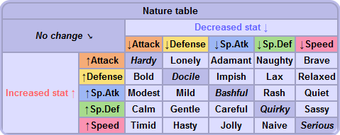 Em vez de ser apenas uma personalidade superficial, as Naturezas realmente afetam o crescimento de um Pokémon. Cada natureza aumenta uma de suas estatísticas em 10% e diminui uma em 10%. Cinco naturezas aumentam e diminuem a mesma estatística e, portanto, não têm efeito.