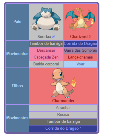 Por exemplo, se um Snorlax macho que conhece Belly Drum (Tambor de barriga) for cruzado com uma Charizard fêmea que conhece Dragon Rush (corrida do dragão) , o Charmander resultante conhecerá Belly Drum e Dragon Rush.